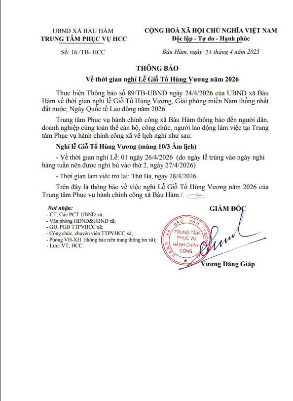<p data-path-to-node="4">Căn cứ theo Thông báo số <b data-path-to-node="4" data-index-in-node="25"><strong>89/TB-UBND</strong></b> ngày 24/4/2026 của UBND xã Bàu Hàm về thời gian nghỉ lễ Giỗ Tổ Hùng Vương, Giải phóng miền Nam thống nhất đất nước và Ngày Quốc tế Lao động năm 2026, Trung tâm Phục vụ HCC xã Bàu Hàm thông báo lịch nghỉ cụ thể:</p><p data-path-to-node="5"><b data-path-to-node="5" data-index-in-node="0"><strong>1. Thời gian nghỉ lễ Giỗ Tổ Hùng Vương (mùng 10/3 Âm lịch):</strong></b></p><ul data-path-to-node="6"><li data-list-item-id="e9e038696ea2b9233debda6f167b5a72a"><p data-path-to-node="6,0,0"><b data-path-to-node="6,0,0" data-index-in-node="0"><strong>Số ngày nghỉ:</strong></b> 01 ngày.</p></li><li data-list-item-id="ebd575215e72d5420054660629152184a"><p data-path-to-node="6,1,0"><b data-path-to-node="6,1,0" data-index-in-node="0"><strong>Ngày nghỉ chính thức:</strong></b> Chủ Nhật, ngày <b data-path-to-node="6,1,0" data-index-in-node="37"><strong>26/4/2026</strong></b>.</p></li><li data-list-item-id="e4e0723bc08793607b1f8d13855e5a031"><p data-path-to-node="6,2,0"><b data-path-to-node="6,2,0" data-index-in-node="0"><strong>Nghỉ bù:</strong></b> Do ngày lễ trùng vào ngày nghỉ hàng tuần, toàn thể cán bộ, công chức và người lao động sẽ được <b data-path-to-node="6,2,0" data-index-in-node="104"><strong>nghỉ bù vào Thứ Hai, ngày 27/4/2026</strong></b>.</p></li></ul><p data-path-to-node="7"><b data-path-to-node="7" data-index-in-node="0"><strong>2. Thời gian làm việc trở lại:</strong></b></p><ul data-path-to-node="8"><li data-list-item-id="ee780ddb4bd55592b07b56941b02f32c2"><p data-path-to-node="8,0,0">Trung tâm sẽ bắt đầu tiếp nhận hồ sơ và làm việc bình thường trở lại vào <b data-path-to-node="8,0,0" data-index-in-node="73"><strong>Thứ Ba, ngày 28/4/2026</strong></b>.</p></li></ul><blockquote data-path-to-node="10"><p data-path-to-node="10,0"><b data-path-to-node="10,0" data-index-in-node="0"><strong>Lưu ý:</strong></b> Trung tâm Phục vụ HCC xã Bàu Hàm xin thông báo để Quý người dân, doanh nghiệp chủ động nắm bắt thông tin và sắp xếp kế hoạch làm việc.</p></blockquote><p data-path-to-node="11"><b data-path-to-node="11" data-index-in-node="0"><strong>Trân trọng thông báo!</strong></b></p><figure class="image"><img style="aspect-ratio:594/812;" src="https://bauham.dongnai.gov.vn/uploads/bauham/news/2026_04/7f50411b-491d-49bb-9f1d-a17a430ff9e9.png" width="594" height="812" /></figure>