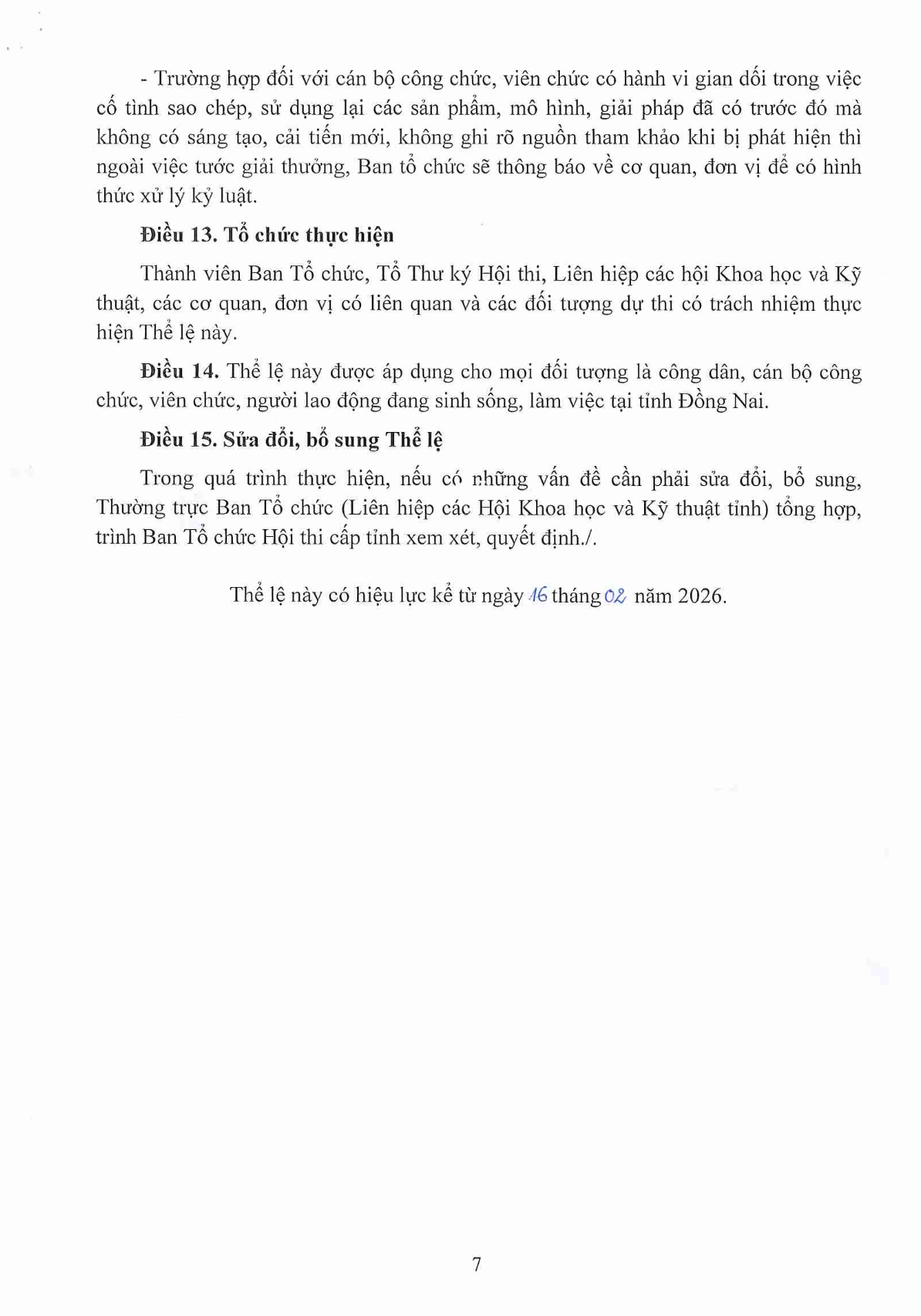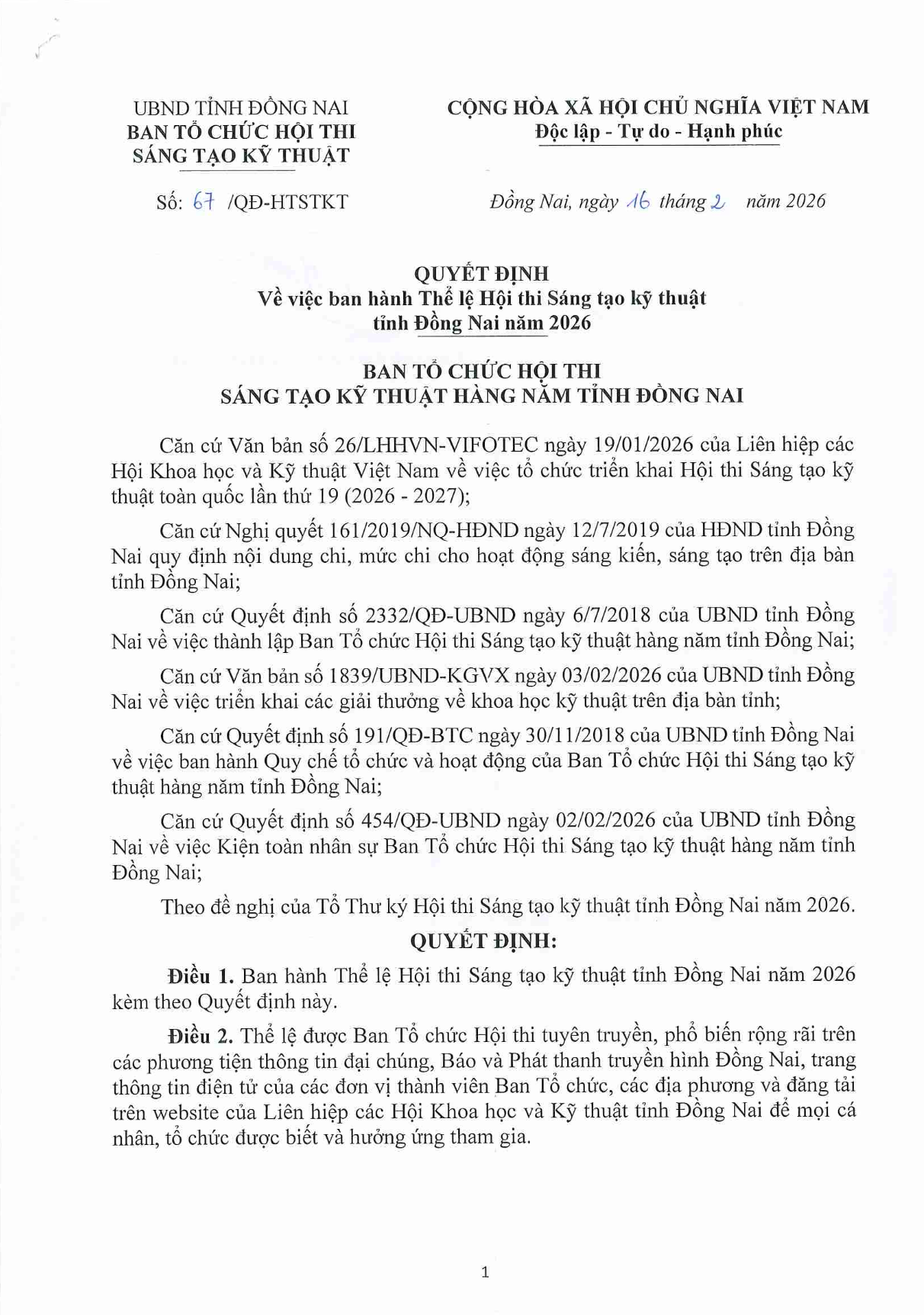 Nhằm khơi dậy phong trào thi đua lao động sáng tạo trong mọi tầng lớp nhân dân, thúc đẩy ứng dụng khoa học công nghệ vào sản xuất và đời sống, Ban Tổ chức Hội thi Sáng tạo kỹ thuật tỉnh Đồng Nai chính thức ban hành Kế hoạch triển khai Hội thi năm 2026.