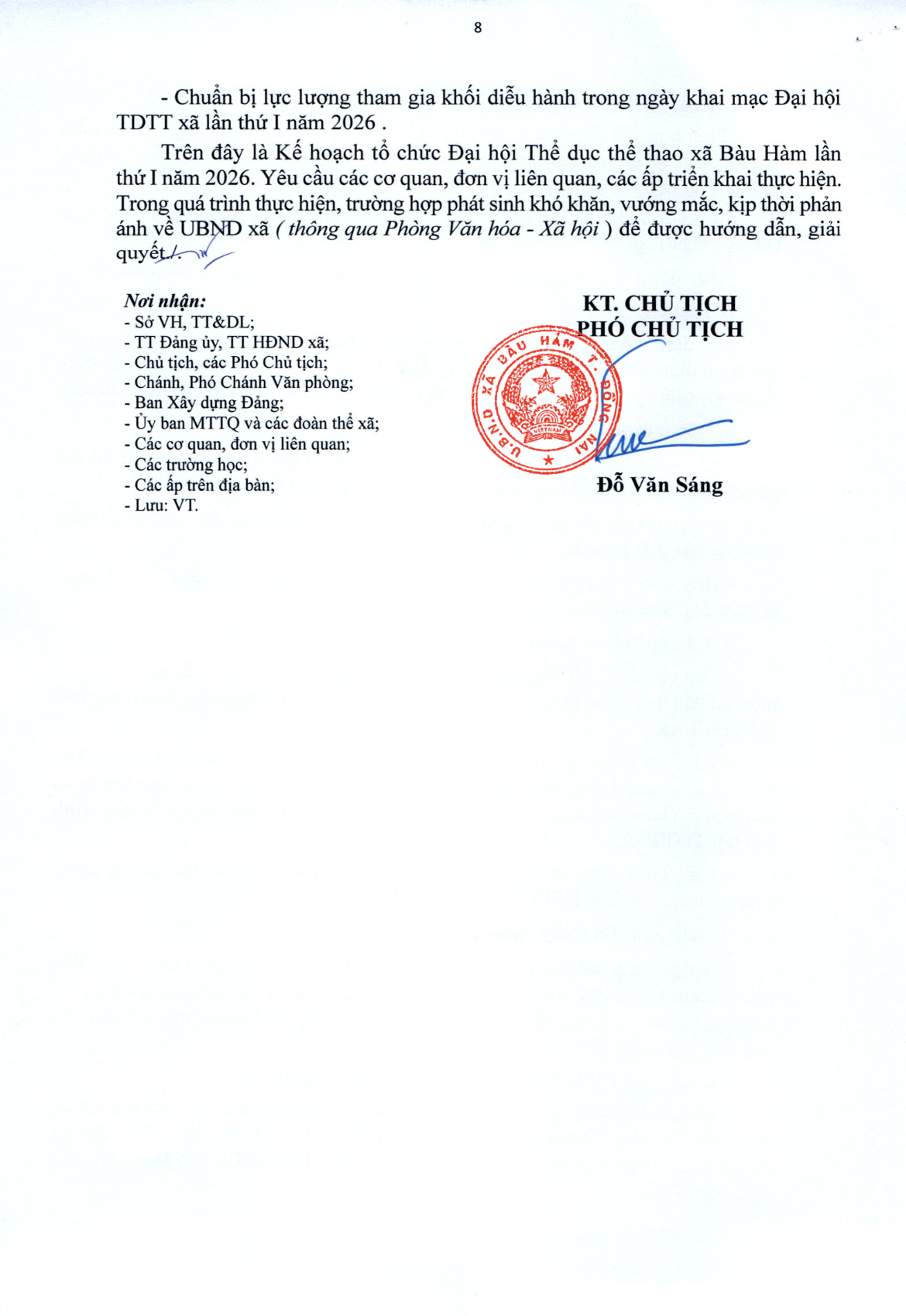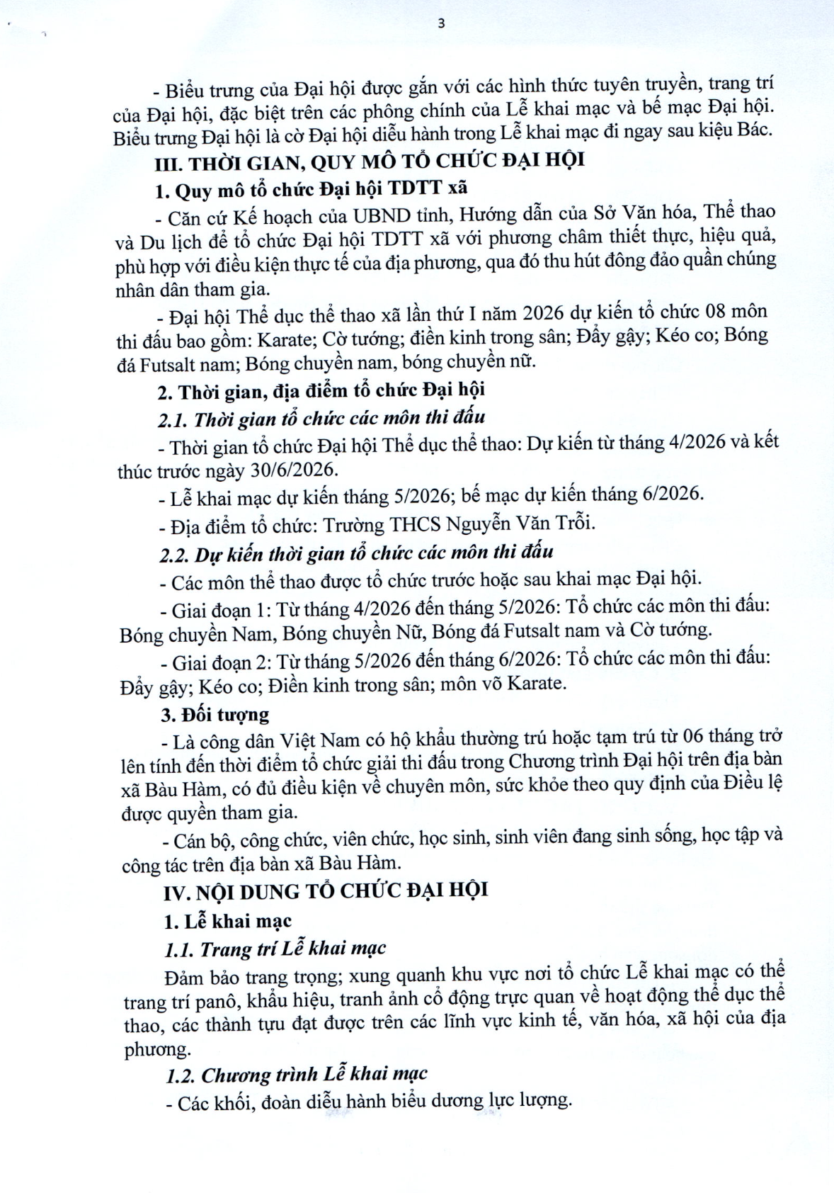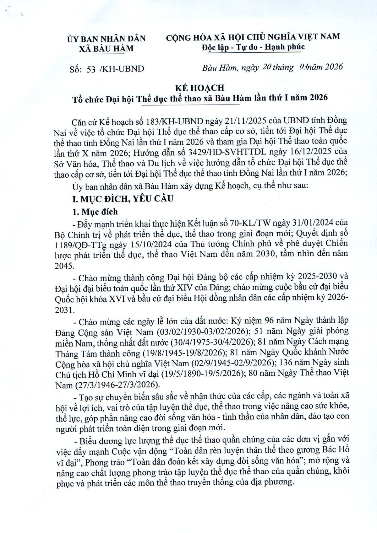 Đại hội TDTT xã Bàu Hàm lần thứ I năm 2026 là sự kiện có ý nghĩa chính trị - xã hội quan trọng. Ban Tổ chức rất mong nhận được sự hưởng ứng nhiệt tình, tham gia cổ vũ của đông đảo quần chúng nhân dân để ngày hội thực sự trở thành động lực thúc đẩy phát triển kinh tế, văn hóa tại địa phương./.