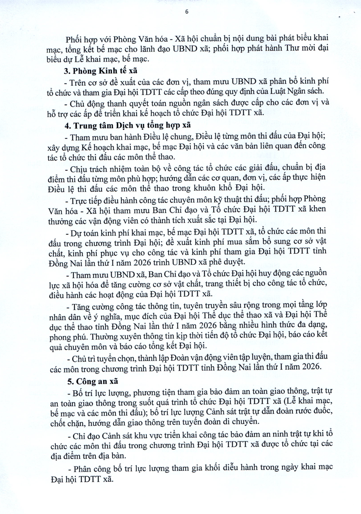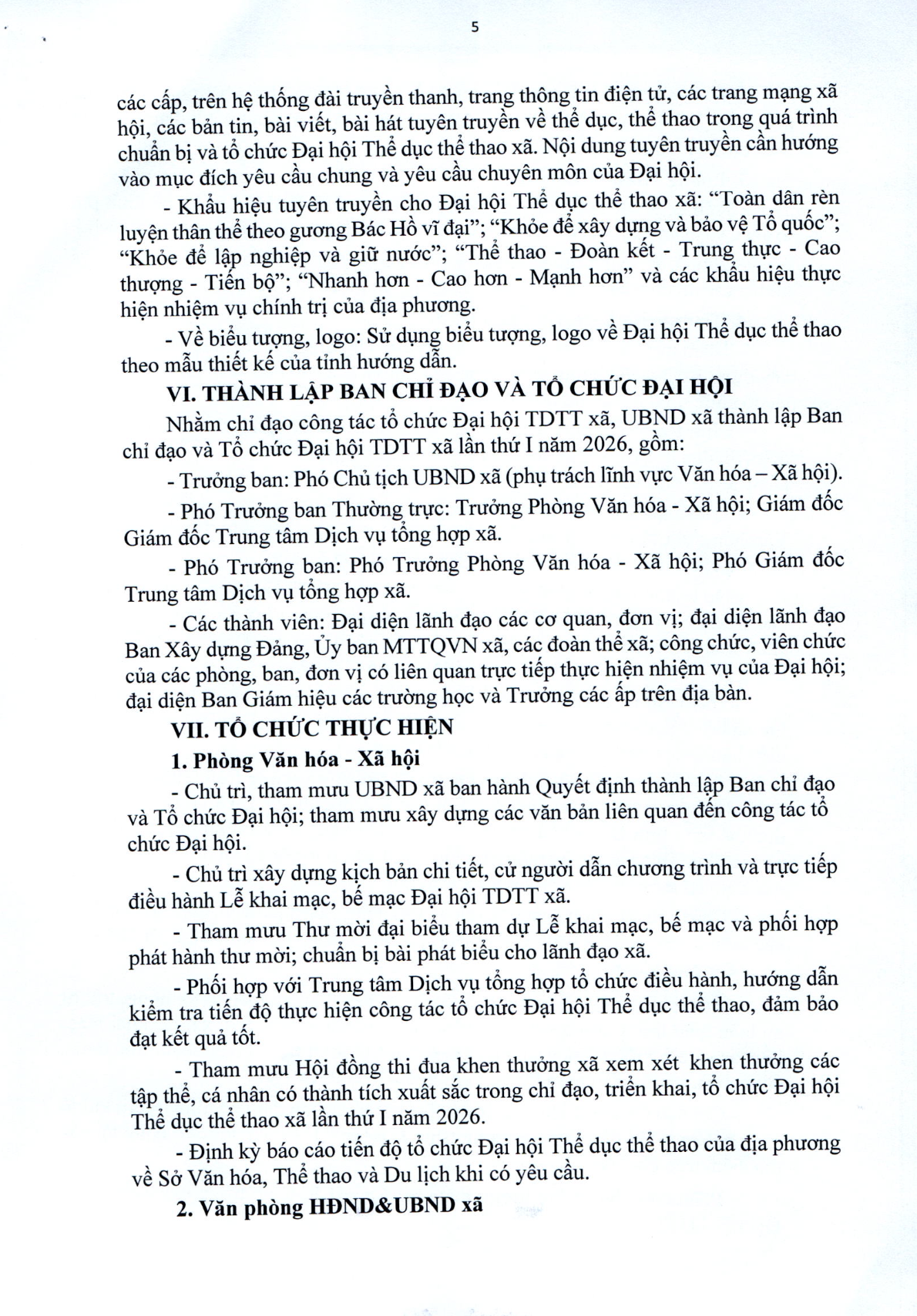 UBND xã đã thành lập Ban Chỉ đạo do Phó Chủ tịch UBND xã (phụ trách Văn hóa – Xã hội) làm Trưởng ban. Công tác an ninh trật tự, y tế và hậu cần được giao cho Công an xã, Ban Chỉ huy Quân sự và Trạm Y tế phối hợp chặt chẽ nhằm đảm bảo Đại hội diễn ra an toàn, tiết kiệm và hiệu quả.